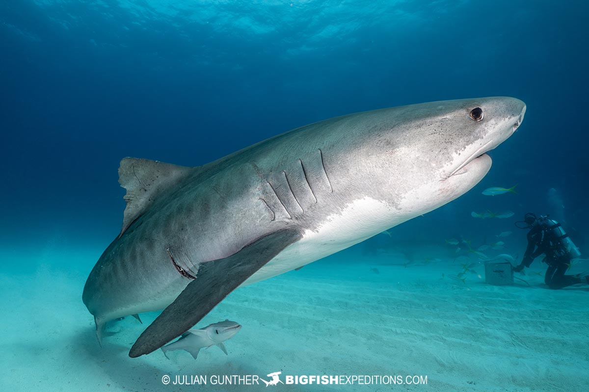 Tiger Shark diving at Tiger Beach in the Bahamas.